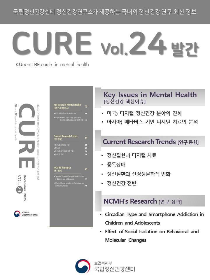 『 CURE 』 Vol.24은 정신건강 핵심이슈 ‘미국) 디지털 정신건강 분야의 진화’과 ‘아시아) 메타버스 기반 디지털 치료의 분석: 정신건강 치료에서의 효과와 잠재적 위험’부터 정신질환과 디지털 치료, 중독장애, 정신질환과 신경생물학적 변화, 정신건강 전반에 관련된 연구의 최신 동향과 센터 연구성과에 대한 내용을 정리하였습니다.